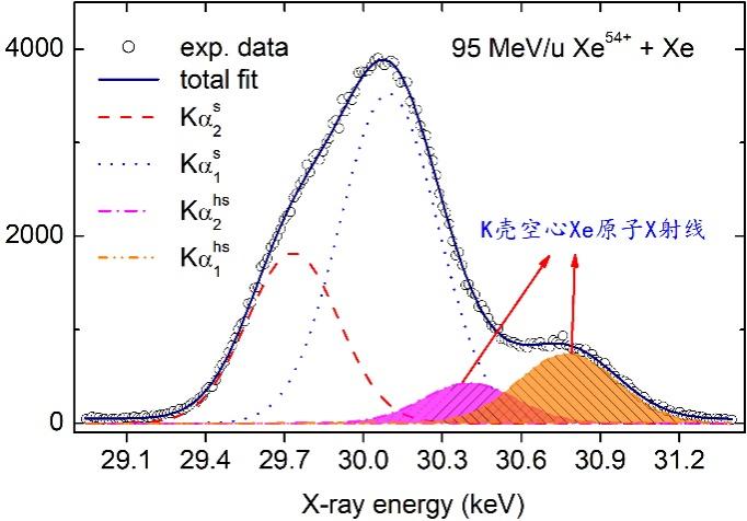 針對高效制備重空心原子并對其進行系統(tǒng)性研究的難題,科研團隊在蘭州重離子加速器冷卻儲存環(huán)(HIRFL-CSR)及其氣體內(nèi)靶裝置上開展了相關實驗,利用能量95-197 MeV/u的全裸氙離子與氙靶碰撞,測量了反應后靶原子的X射線譜。研究發(fā)現(xiàn),得益于全裸氙離子所攜帶的強庫侖場及對稱碰撞中內(nèi)殼電子轉(zhuǎn)移過程,空心氙原子的相對產(chǎn)額相比K殼單空穴氙原子最高可達28.6%。該研究表明全裸重離子-原子碰撞是高產(chǎn)額制備重空心原子的有效途徑。
