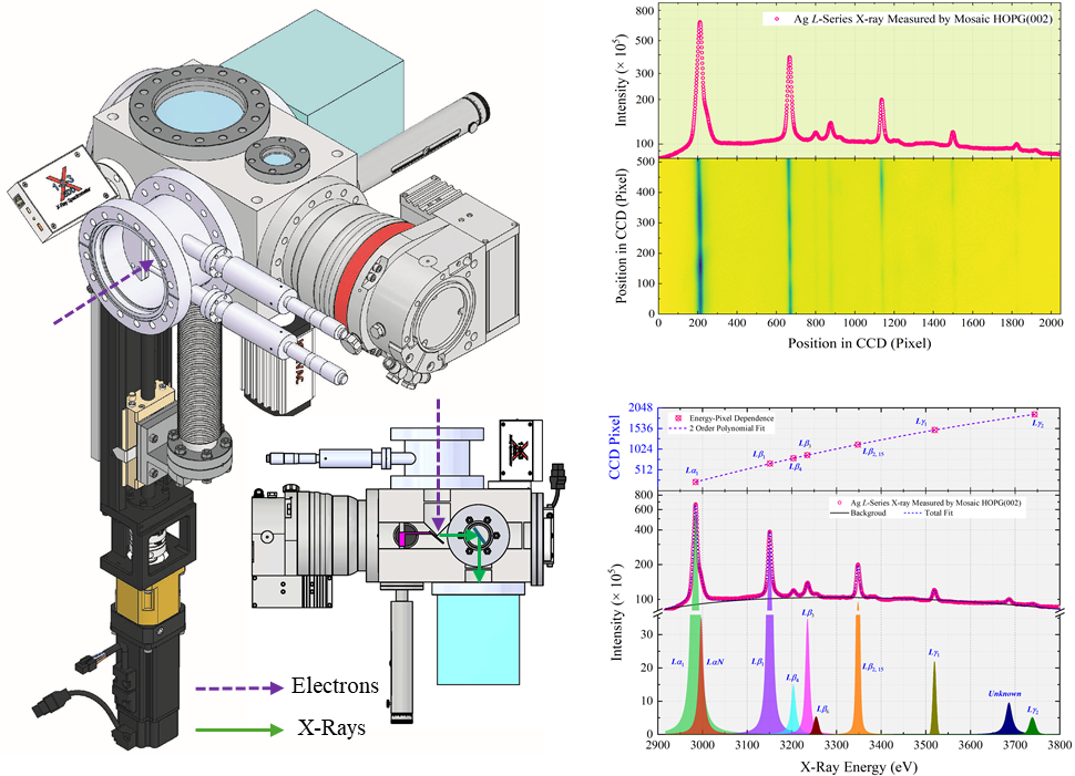 為進一步研究這類空心原子的產(chǎn)生與退激特性,科研人員自主研發(fā)了用于多空穴離子X射線精細結構測量的緊湊型寬帶高分辨平面晶體譜儀。該譜儀采用了針對多空穴離子X射線譜特點的獨特幾何構型,通過靶平動伴隨晶體同步轉(zhuǎn)動,大幅提升了譜儀調(diào)節(jié)精準度和便捷性。此外,該譜儀在緊湊的空間內(nèi)實現(xiàn)了0.53-19.3 keV的動態(tài)范圍及0.04-6.58 keV的單次曝光帶寬,全動態(tài)范圍內(nèi)的能譜分辨力好于102,采用馬賽克晶體時的探測效率較傳統(tǒng)平面晶體譜儀提高了20倍以上。
