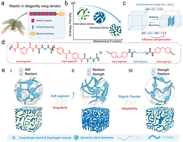 圖1. 受蜻蜓角質(zhì)層中彈性蛋白啟發(fā)的低熵罰聚氨酯彈性體設(shè)計(jì)制備示意圖