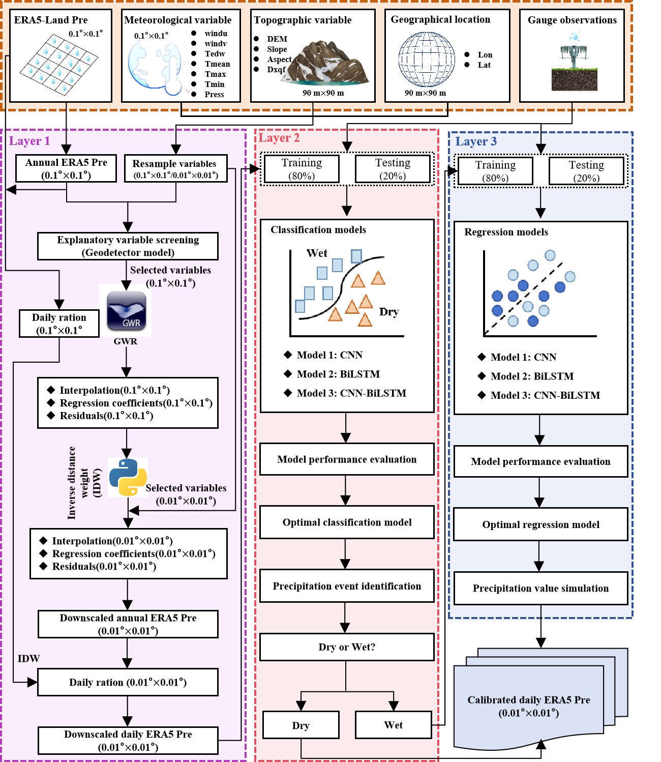 TLIDC技術框架。TLIDC框架整體分為三部分:降水數(shù)據(jù)的空間降尺度(表示為Layer 1)、降水事件的識別(表示為Layer 2)和降水量的模擬(表示為Layer 3)。Layer 1通過GWR模型,提供高空間分辨率的降水數(shù)據(jù),Layer 2和Layer 3利用構建的CNN-BiLSTM模型來提高降尺度后降水數(shù)據(jù)的準確性