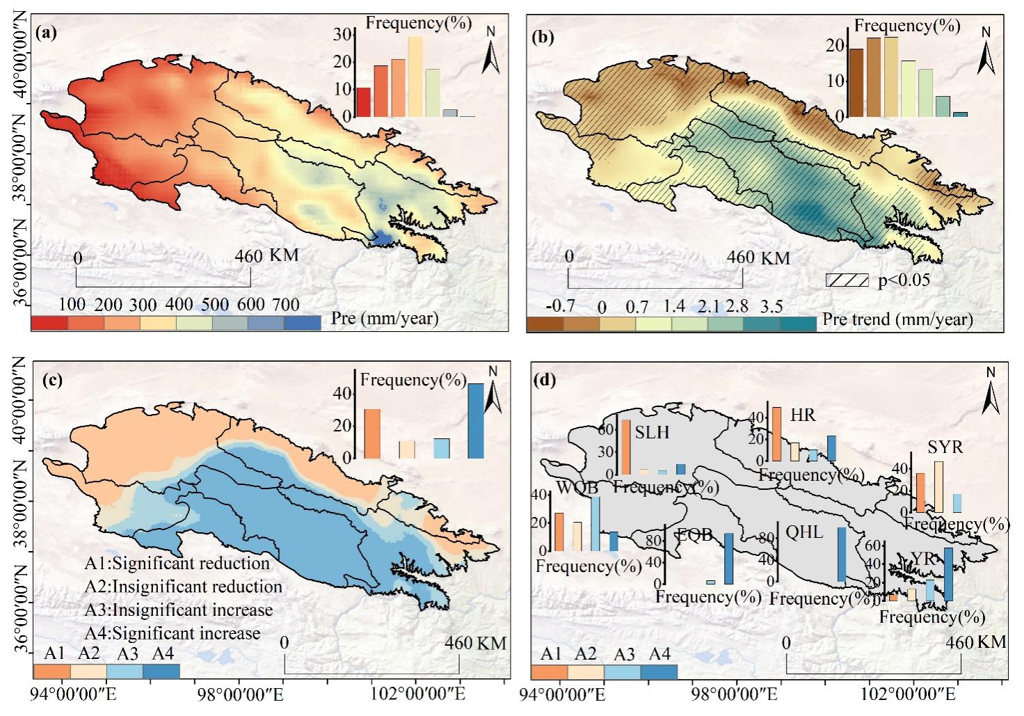 1950-2024年祁連山降水重建結果及時空變化特征。(a)重建降水的空間分布;(b) Sen’s趨勢估計與Mann-Kendall顯著性檢驗結果;(c)祁連山降水時空變化的趨勢類型;(d)各子流域降水時空變化的趨勢類型。