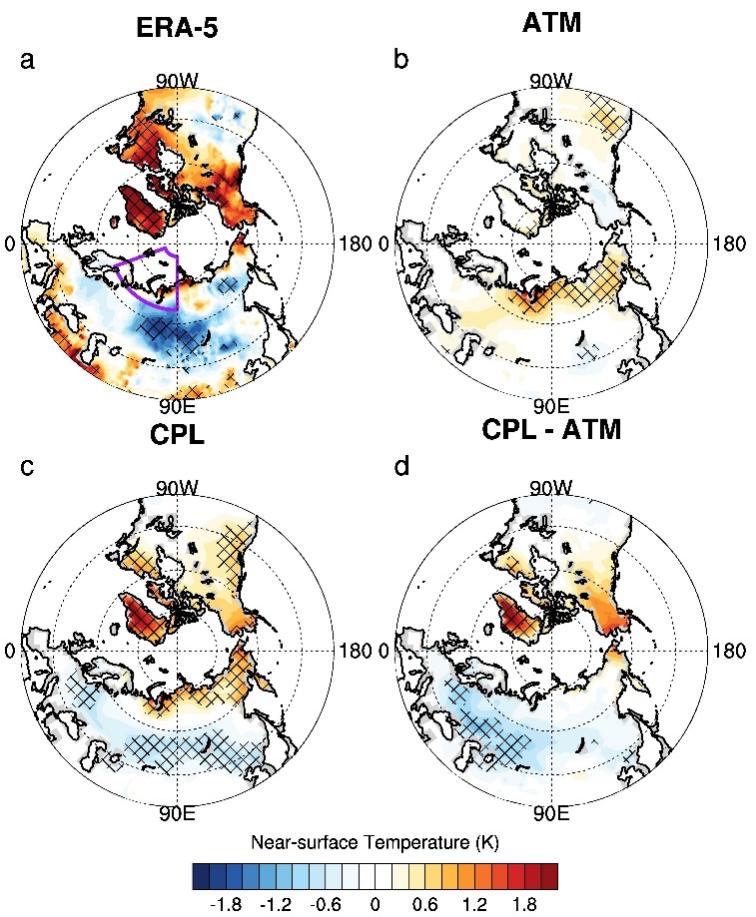 從ERA-5再分析資料(a)、僅考慮大氣過程的大氣模式試驗(b)及包含海-氣耦合過程的全耦合模式試驗(c)得到的歷史時期海冰消融導(dǎo)致的冬季地表氣溫異常(K)。(d)為全耦合模式試驗與大氣模式試驗結(jié)果之差