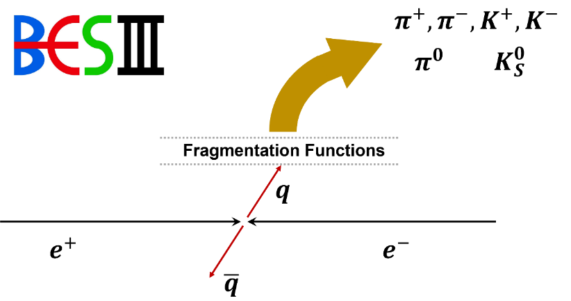 標(biāo)準(zhǔn)模型的量子色動力學(xué)(QCD)是描述部分子(夸克和膠子)間強相互作用的理論,它的最大挑戰(zhàn)來自于低能區(qū)的非微擾性質(zhì)。由于色禁閉效應(yīng),實驗上無法直接觀測到帶色荷的部分子,只能探測色中性的強子。碎裂函數(shù)描述了部分子的強子化過程,對其研究是理解強子產(chǎn)生機制的重要手段。正負(fù)電子對撞中單舉強子的產(chǎn)生被認(rèn)為是研究碎裂函數(shù)最有效的過程之一(如圖1所示)。目前,在質(zhì)心能量低于10 GeV的區(qū)域,能用于碎裂函數(shù)研究的高精度正負(fù)電子對撞實驗數(shù)據(jù)極為有限。