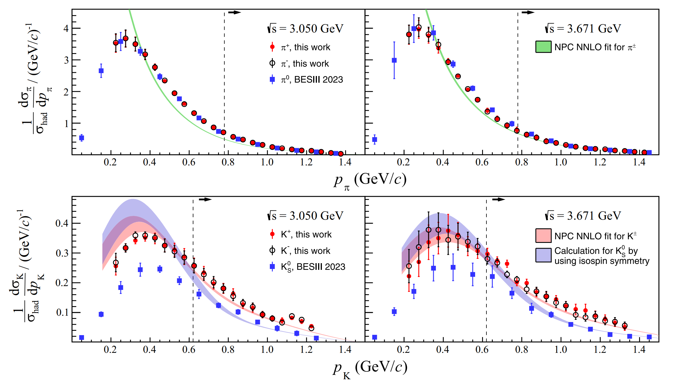 面對這一挑戰(zhàn),團隊利用北京譜儀(BESIII)能量掃描數(shù)據(jù),精確測量了帶電pion和Kaon介子單舉產(chǎn)生微分截面,最高精度達(dá)1%~2%。結(jié)合NPC合作組(Non-perturbative Physics Collaboration)的全局?jǐn)?shù)據(jù)擬合研究,這一新的測量結(jié)果與基于次次領(lǐng)頭階(NNLO)精度的量子色動力學(xué)(QCD)理論分析相符合,尤其是大動量強子區(qū)域(如圖2所示)。該研究成果為檢驗低能區(qū)QCD因子化定理及部分子碎裂過程中同位旋對稱性的有效性提供了有力的實驗支持,對深入理解強相互作用動力學(xué)具有重要意義。