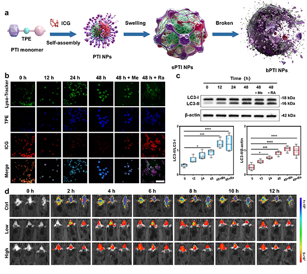團(tuán)隊(duì)進(jìn)一步探索溶酶體功能變化與Aβ蛋白相分離之間的關(guān)系。通過(guò)ATRP合成pH響應(yīng)骨架,將AIE染料四苯乙烯(TPE)共價(jià)接枝,并自組裝包載近紅外ACQ染料吲哚菁綠(ICG),形成AIE/ACQ協(xié)同的比率成像納米結(jié)構(gòu)探針(PTI),實(shí)現(xiàn)AD自噬溶酶體酸化缺陷及其驅(qū)動(dòng)的相分離過(guò)程的可視化“全流程”監(jiān)測(cè)。