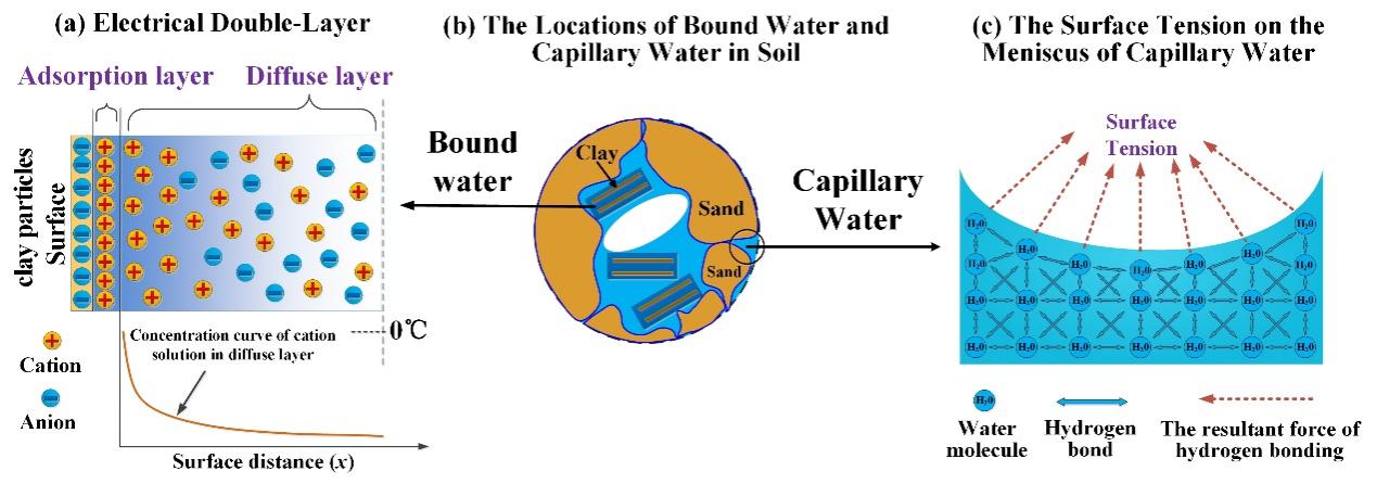 研究通過將電解質(zhì)溶液相變機(jī)制與雙電層理論相結(jié)合,構(gòu)建了凍土未凍水理論模型,定量刻畫了土壤鹽分(溶液濃度、溶質(zhì)種類及比例)、表面電荷密度、溫度以及土壤類型(比表面積)等因素對(duì)未凍水含量的影響,克服了傳統(tǒng)土水勢(shì)模型難以實(shí)現(xiàn)物理參數(shù)化的固有局限。