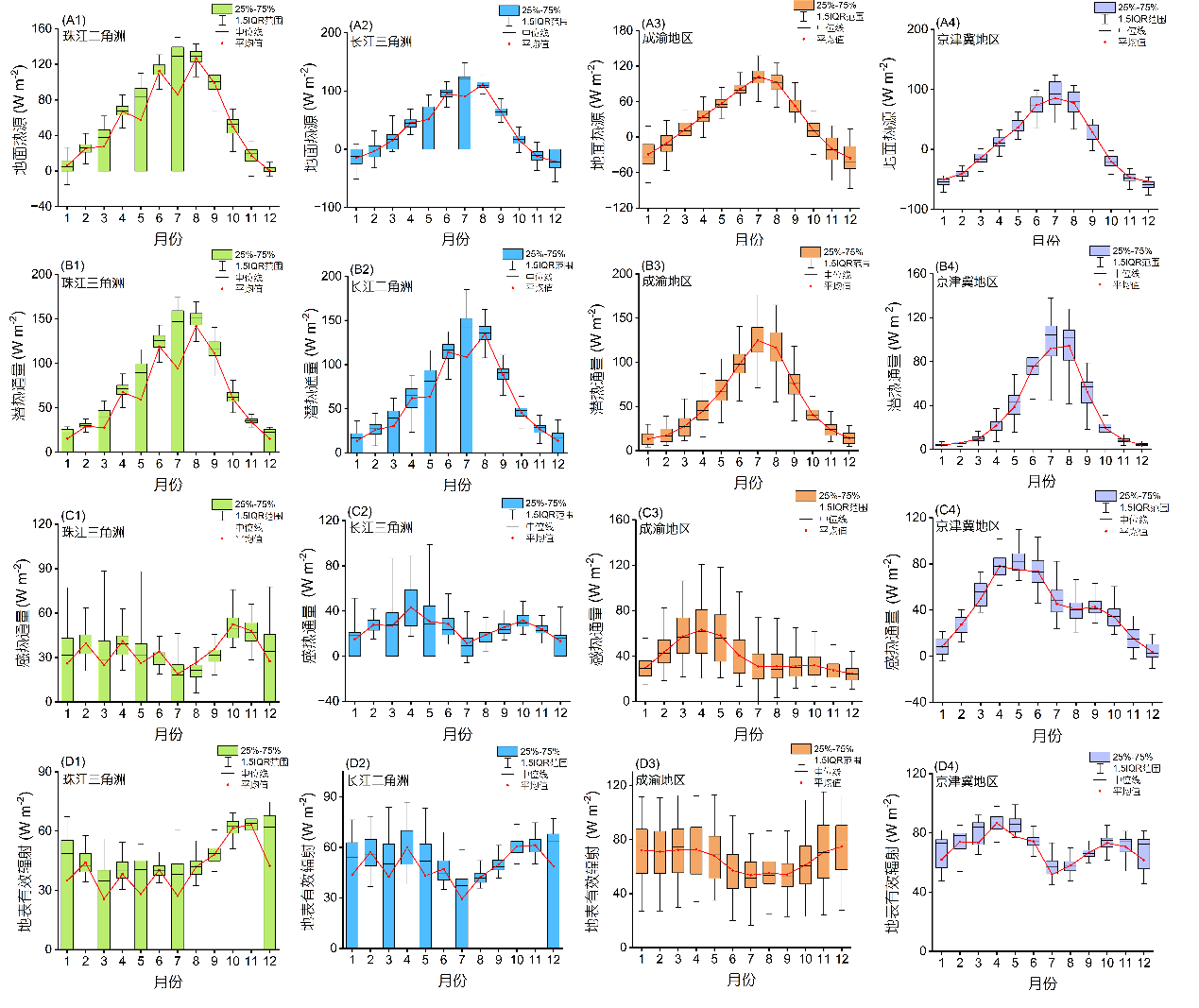 研究表明,四個(gè)城市群的地面熱源均呈現(xiàn)“夏強(qiáng)冬弱”的季節(jié)性特征,區(qū)域分布差異顯著。珠三角熱源強(qiáng)度最強(qiáng),但存在局部低值區(qū);長(zhǎng)三角熱源高值主要沿江分布,大城市熱源相對(duì)偏低;成渝地區(qū)熱源高值集中于盆地西部,且波動(dòng)較大;京津冀地區(qū)則表現(xiàn)為“南強(qiáng)北弱”的格局,北部冬季易轉(zhuǎn)為熱匯。這些差異反映了地形、氣候條件與城市化水平的綜合調(diào)控作用。