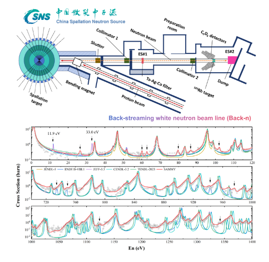 在中子俘獲反應研究方面,研究團隊基于中國散裂中子源反角白光中子束線(CSNS Back-n),利用高純度銠-103靶材開展了1eV-1MeV能區(qū)中子俘獲反應截面的直接測量。實驗結(jié)果表明,國際主要評價數(shù)據(jù)庫ENDF/B-VIII.1,JEFF-3.3和JENDL-5中11.9 eV和33.0 eV處標注的共振能級并不存在。分析認為,上述數(shù)據(jù)庫中的共振峰可能源于早期實驗樣品中鉑族元素鈀(108Pd)與鉑(195Pt)雜質(zhì)的貢獻。此外,基于CSNS Back-n束流的高注量率和優(yōu)異的飛行時間分辨能力,本次實驗首次發(fā)現(xiàn)了銠-103的8個新共振峰,并利用R-矩陣程序SAMMY提取了相應的共振參數(shù)。
