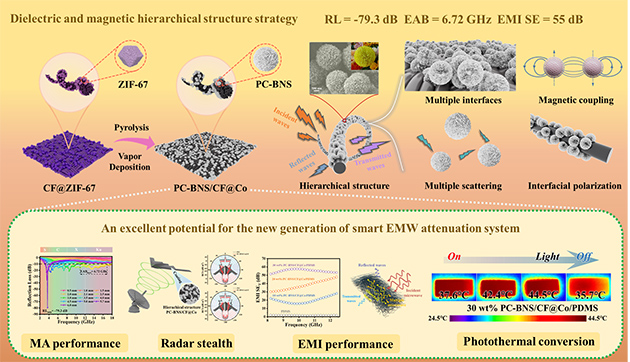 研究人員還通過高溫自催化生長工藝,在碳纖維(CFs)表面構(gòu)建了仿球菊狀氮化硼微米球(PC-BNSs),制備出一種具有多尺度分級結(jié)構(gòu)的復(fù)合材料。該結(jié)構(gòu)集成了PC-BNSs、CFs與磁性Co納米顆粒(PC-BNS/CF@Co),利用多尺度協(xié)同效應(yīng)、多重散射及磁-電耦合機制,大幅提升了復(fù)合材料對電磁波的衰減能力。實驗證實,該PC-BNS/CF@Co復(fù)合材料在極低填充下即可實現(xiàn)強吸波與寬頻吸收。此外,復(fù)合薄膜還兼具優(yōu)異的以吸收為主導(dǎo)的電磁屏蔽性能(55 dB)和顯著的光熱轉(zhuǎn)換能力,在智能電磁防護領(lǐng)域展現(xiàn)出廣闊的應(yīng)用前景。相關(guān)研究結(jié)果發(fā)表在Chemical Engineering Journal (2025,510,161436)上。