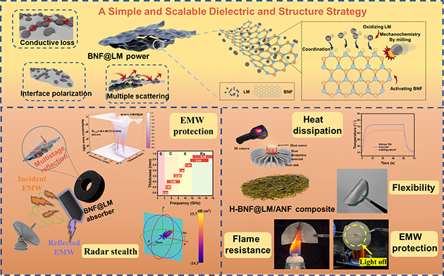 近期,針對傳統(tǒng)h-BN改性方法工藝復(fù)雜和環(huán)境負荷大的問題,研究團隊提出了一種簡易且可擴展的機械力誘導(dǎo)活化改性策略,調(diào)控h-BN的導(dǎo)熱和吸波性能。該研究利用液態(tài)金屬(LM)的流動性及其高導(dǎo)電特性,通過機械過程讓LM與BNFs充分接觸并發(fā)生反應(yīng),從而活化BNFs表面,引入豐富的界面極化中心和缺陷位點(BNF@LM)。優(yōu)化后的BNF@LM復(fù)合材料在維持高效吸波性能的同時,能夠與芳綸納米纖維復(fù)合制成柔性復(fù)合薄膜,展現(xiàn)出優(yōu)異的熱管理及良好的阻燃性能,確保了材料在極端環(huán)境下運行的可靠性。相關(guān)研究結(jié)果發(fā)表在Journal of Advanced Ceramics (2025,14,9221208) 上。