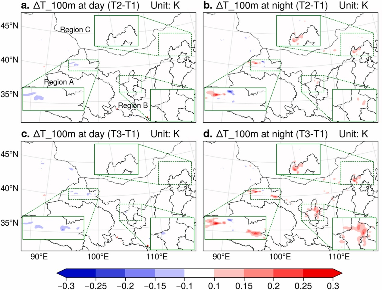 大型風電場群對100米高度處年平均氣溫的影響(a, c)白天,(b, d)夜間