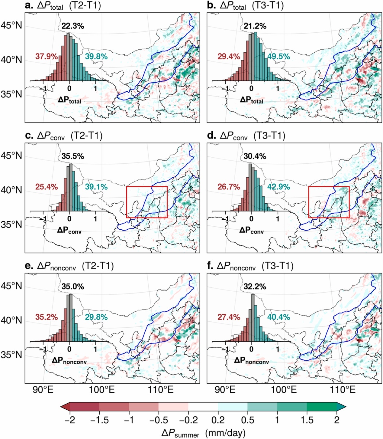 大規(guī)模風電場群對夏季(a, b)總降水量、(c, d)對流性降水量及(e, f)非對流性降水量的影響