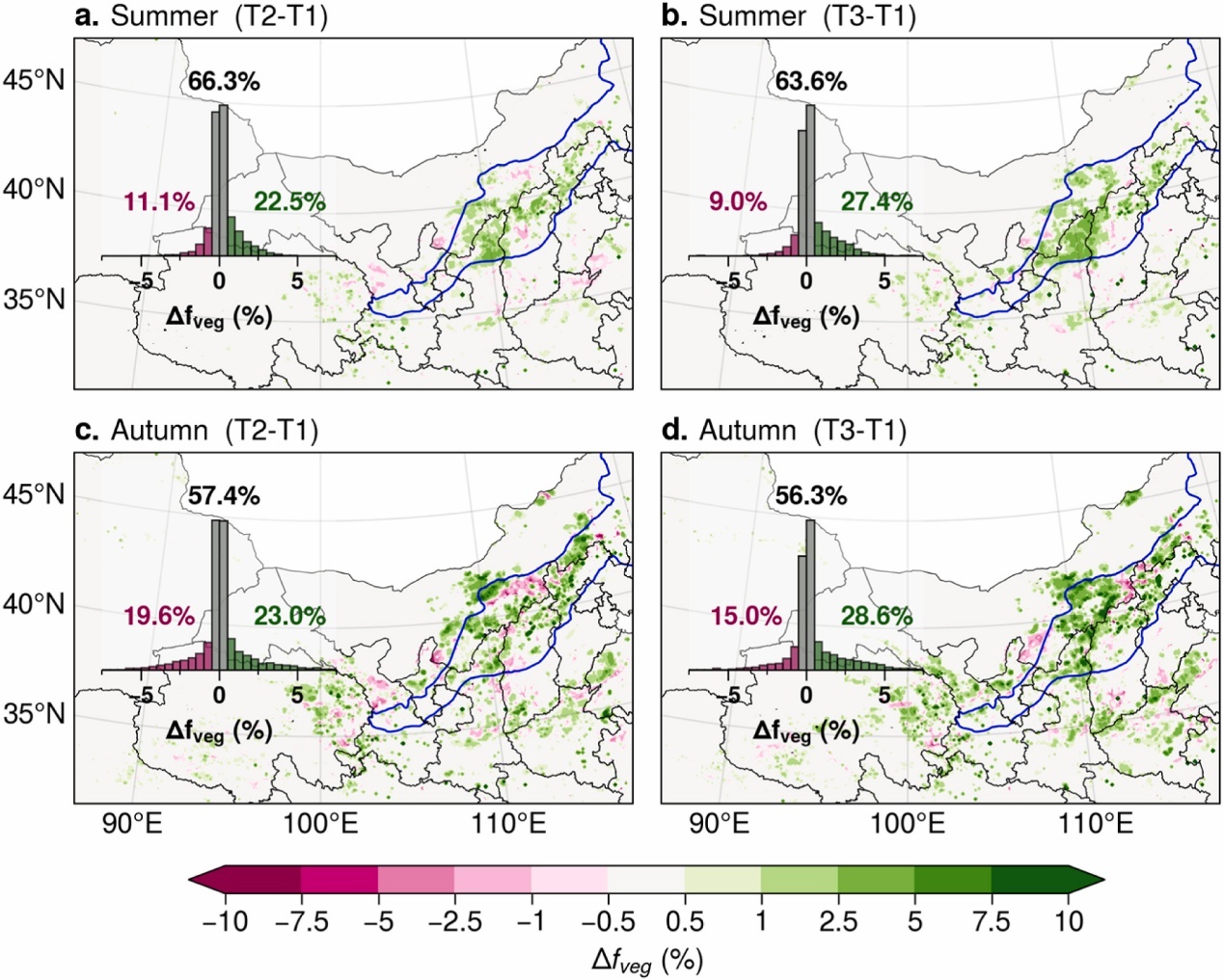 大規(guī)模風電場群建設前后植被覆蓋度差異的空間分布(a, b)夏季,(c, d)秋季