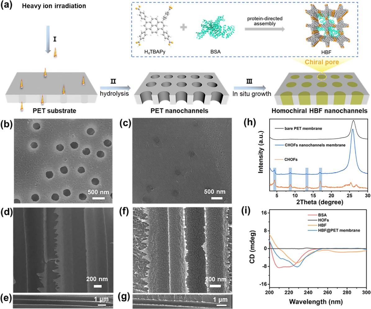近日,中國科學(xué)院近代物理研究所重離子科學(xué)與技術(shù)全國重點實驗室材料研究中心與蘭州大學(xué)化學(xué)化工學(xué)院、東江實驗室合作,在手性分離膜研究方面取得重要進(jìn)展。研究團(tuán)隊依托蘭州重離子加速器(HIRFL)提供的重離子輻照技術(shù),成功制備出一種具有同手性特征的氫鍵生物雜化框架核孔膜(HBF@PET),實現(xiàn)了對氨基酸對映體的高效、精準(zhǔn)分離。相關(guān)成果于近日發(fā)表在國際化學(xué)期刊《美國化學(xué)會志》(Journal of the American Chemical Society)上。