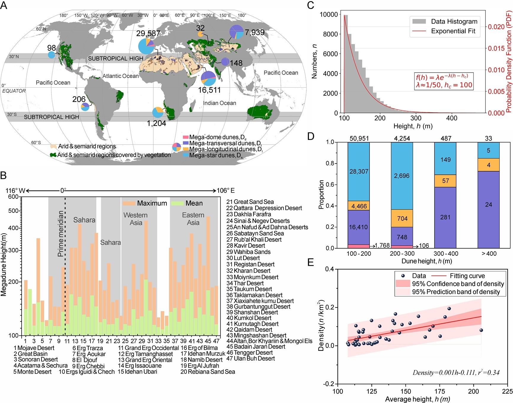 研究發(fā)現(xiàn),全球97%以上高大沙山集中于撒哈拉沙漠與亞洲干旱區(qū),充足沙源與強勁風力是沙山發(fā)育的基礎(chǔ)條件;澳大利亞沙漠因植被覆蓋度高、輸沙量有限,而未發(fā)育沙山。全球近91%的沙山高度介于100–200米,且以星狀沙山為主,表明多向風況更利于沙山的形成;高度超300米后以橫向沙山為主,超過400米的沙山僅有33座??臻g上,大陸內(nèi)部沙丘場沙山平均高度更高且沙山密度隨沙山平均高度升高而顯著增加。