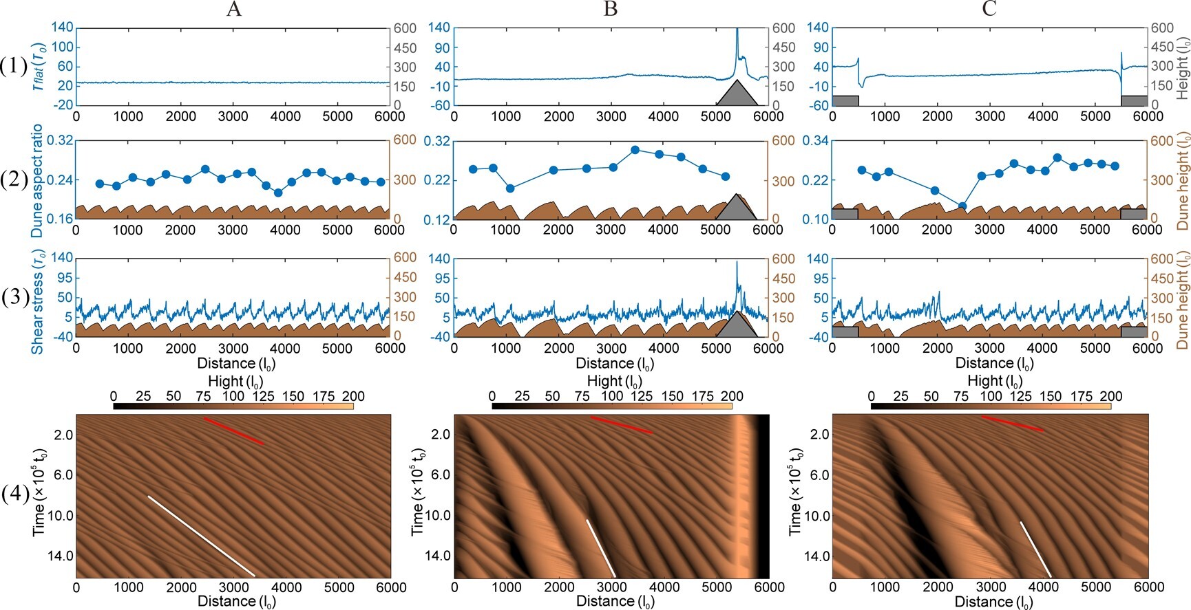數(shù)值模擬結(jié)果揭示了沙山發(fā)育的核心機制:平坦地形下沙物質(zhì)均勻分配,抑制高大沙山發(fā)育;山體、盆地等正負地形引發(fā)剪切應(yīng)力突變,增強沙通量匯聚與沙丘碰撞融合,加速沙丘“粗化”長高。地形通過持續(xù)塑造風場與沙源空間異質(zhì)性,成為高大沙山形成的關(guān)鍵動力。