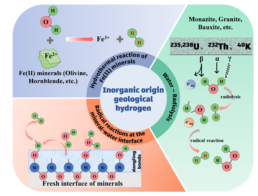 研究指出,含F(xiàn)e(II)礦物水熱反應(yīng)、水輻射分解以及礦物-水界面自由基反應(yīng)是無(wú)機(jī)來源地質(zhì)氫的三種主要形成途徑,其全球年產(chǎn)氫率分別為0.2×1011–6.3×1012 mol/year,1.6×1010–1.35×1013 mol/year,和1.1×108–2.5×1010 mol/year。含F(xiàn)e(Ⅱ)礦物水熱反應(yīng)的核心機(jī)制是Fe(II)的電子轉(zhuǎn)移與礦物相變,主要受溫度控制;水輻射分解則通過天然放射性元素輻照水分解生成氫,主要受輻射類型和劑量影響;而礦物-水界面自由基反應(yīng)主要來源于界面水分子在不飽和配位位點(diǎn)反應(yīng)形成自由基并進(jìn)一步生成氫氣,其主要受礦物類型控制。上述反應(yīng)還受到共存離子、水溶氣體等地質(zhì)環(huán)境條件的共同調(diào)控。