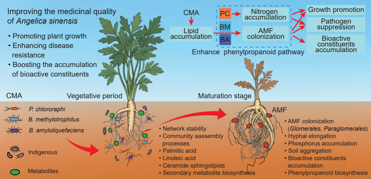 兩項(xiàng)研究分別從激素與苯丙烷代謝調(diào)控以及“功能互補(bǔ)菌群—AMF協(xié)同作用”兩個層面,揭示了微生物介入對當(dāng)歸生長和藥用成分積累的調(diào)控機(jī)制,為“生防菌調(diào)控—宿主響應(yīng)—品質(zhì)形成”提供了重要的實(shí)驗(yàn)依據(jù),并為相關(guān)機(jī)制研究奠定了堅實(shí)基礎(chǔ)。
