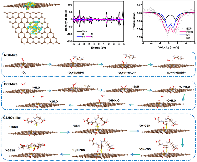 近日,中國科學(xué)院蘭州化學(xué)物理研究所天然藥物與化學(xué)測量研究中心海軍研究員團(tuán)隊(duì),發(fā)展了一種以氧化石墨烯為二維支撐載體的Fe單原子納米酶(FeNC SAzymes)。與傳統(tǒng)平面Fe-N4構(gòu)型相比,軸向O配位的引入有效打破了對稱配位限制,增強(qiáng)了活性中心的電子調(diào)控能力(圖1)。此外,密度泛函理論計(jì)算解析該關(guān)鍵活性能有效降低多酶反應(yīng)途徑的能量勢壘,從而提升NOX、POD和GSHOx等多酶樣級(jí)聯(lián)相關(guān)過程的反應(yīng)效率,為后續(xù)觸發(fā)后放大效應(yīng)提供基礎(chǔ)(圖2)。FeNC SAzymes結(jié)構(gòu)設(shè)計(jì)使Fe中心的電荷分布和d軌道電子態(tài)密度得到優(yōu)化,從而提升其對反應(yīng)中間體的吸附與活化能力以及電子轉(zhuǎn)移效率,為實(shí)現(xiàn)TME識(shí)別、可視化檢測和響應(yīng)研究提供了新方法。