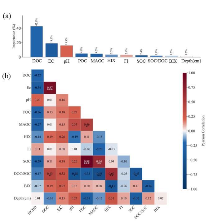 環(huán)境因子與HCBD濃度關(guān)系的隨機森林模型結(jié)果及相關(guān)性分析。(a)隨機森林模型中各環(huán)境變量的特征重要性,按其對HCBD濃度預(yù)測的貢獻度排序。(b)HCBD與環(huán)境因子的Pearson相關(guān)矩陣;紅色和藍色方框分別表示正相關(guān)和負相關(guān)。