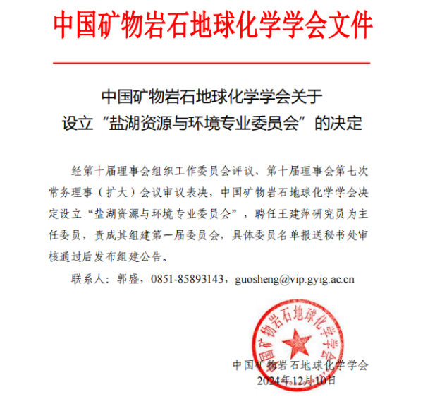 青海鹽湖所牽頭申報(bào)鹽湖資源與環(huán)境專(zhuān)業(yè)委員會(huì)獲中國(guó)礦物巖石地球化學(xué)學(xué)會(huì)批準(zhǔn)設(shè)立