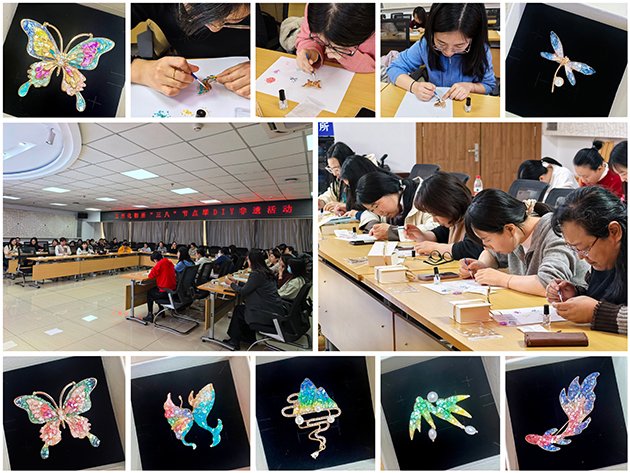 3月13日下午,組織開展了“指尖傳非遺”點(diǎn)翠DIY活動。培訓(xùn)老師向大家介紹了中國點(diǎn)翠工藝非物質(zhì)文化遺產(chǎn)的歷史底蘊(yùn)和文化價值,詳細(xì)講解了點(diǎn)翠胸針的制作過程。涂抹亮油、貼貝殼碎片、表面封層、定型……一片片細(xì)小的螺鈿片鑲嵌在胚底,斑斕色彩流動交融,鮮活生動?;顒訋Т蠹移肺读藗鹘y(tǒng)工藝的浪漫、領(lǐng)略了沉淀千年的藝術(shù)瑰寶。