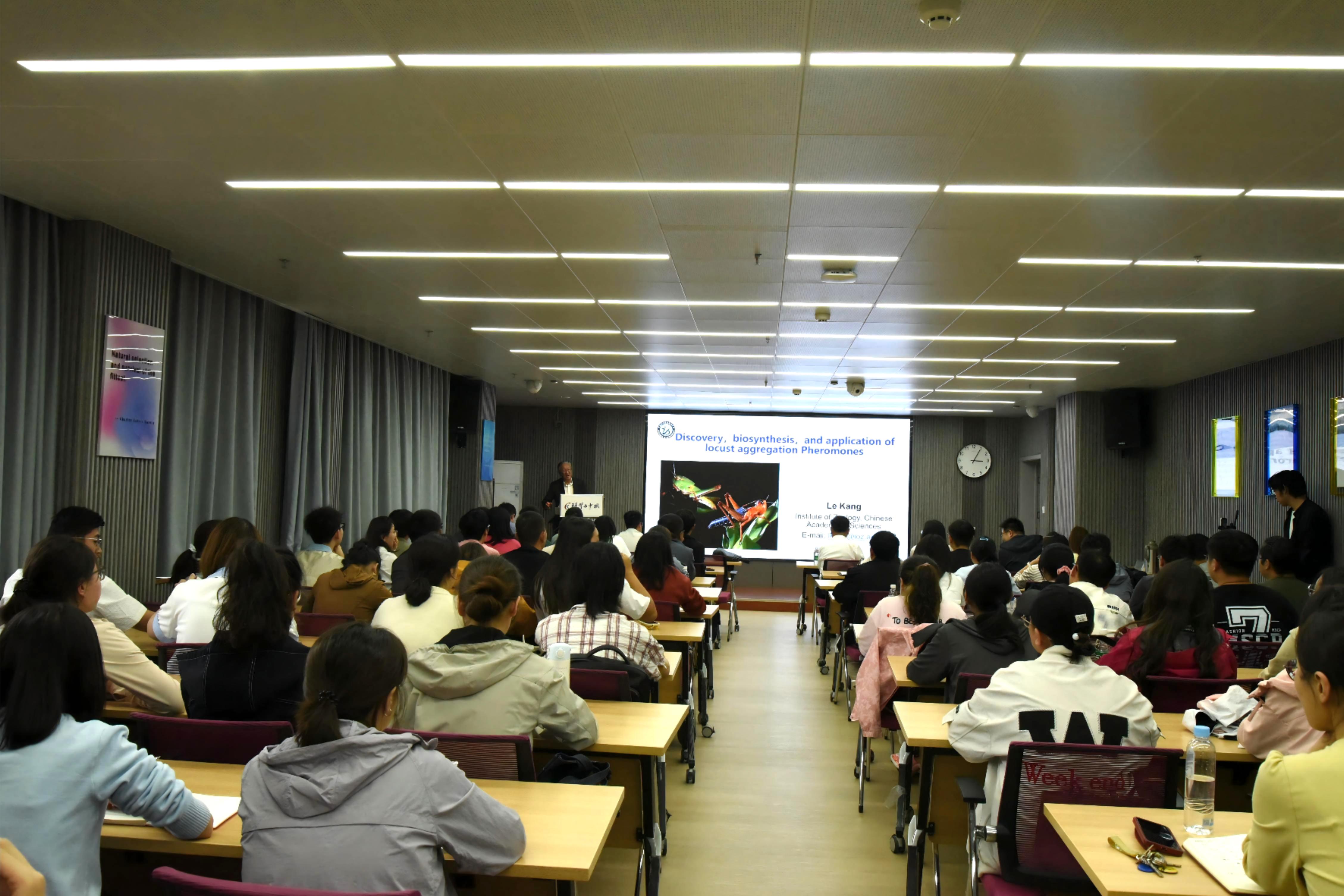 講座環(huán)節(jié),康樂院士詳細(xì)闡述了蝗蟲群聚信息素的發(fā)現(xiàn)研究過程和注意細(xì)節(jié),從基礎(chǔ)理論到應(yīng)用實(shí)踐,層層剖析,向大家講解了蝗蟲群聚信息素的發(fā)現(xiàn)、生物合成和應(yīng)用,生動(dòng)的講解了蝗蟲群聚信息素4-乙烯基苯甲醚(4VA)在蝗蟲體內(nèi)產(chǎn)生的過程,以及蝗蟲利用植物中常見的氨基酸來合成自己特異的群聚信息素。基于對(duì)4VA生物合成途徑的解析,康樂院士研究團(tuán)隊(duì)設(shè)計(jì)出一種小分子抑制劑,能夠精準(zhǔn)調(diào)控4VA的合成和釋放,從而有效干預(yù)蝗蟲的群聚行為。為蝗災(zāi)“綠色防控”提供了全新技術(shù)方案,為開發(fā)與利用昆蟲信息素實(shí)現(xiàn)精準(zhǔn)調(diào)控害蟲行為提供了新的思路,推動(dòng)了害蟲綠色可持續(xù)防控的發(fā)展。