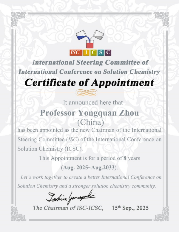 9月15日,在突尼斯舉辦IUPAC國(guó)際溶液化學(xué)會(huì)議(International Conference on Solution Chemistry)期間,青海鹽湖所周永全研究員當(dāng)選為該會(huì)議國(guó)際指導(dǎo)委員會(huì)(International Steering Committee)新任主席。