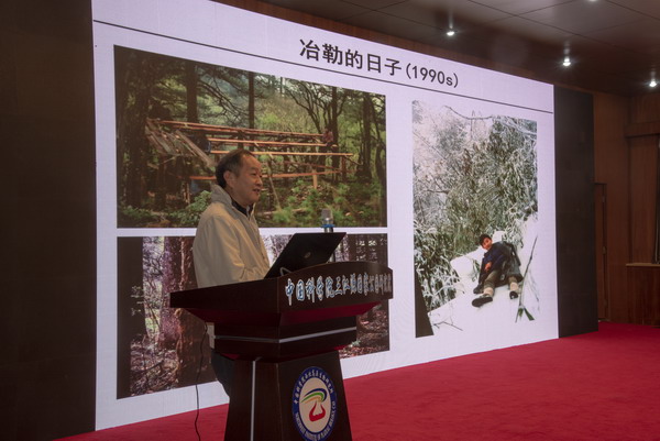魏輔文院士以他的學(xué)術(shù)生涯為主線,講述了其自20世紀(jì)80年代開始從事大熊貓的研究工作,從最初的大熊貓野外調(diào)查、觀察,到率先將種群基因組學(xué)、宏基因組學(xué)、比較基因組學(xué)等新技術(shù)應(yīng)用到大熊貓研究中,闡明了大熊貓的種群歷史、瀕危過程及演化潛力,揭示了大熊貓?jiān)谑承赞D(zhuǎn)換和特化歷程中如何在形態(tài)、行為、生理、遺傳和腸道微生物等方面產(chǎn)生適應(yīng)性演化的規(guī)律;闡明了棲息地破碎化導(dǎo)致大熊貓孤立小種群崩潰的機(jī)制,推動了國家大熊貓放歸和棲息地廊道建設(shè)工程的實(shí)施。魏輔文首次提出“保護(hù)演化生物學(xué)”和“保護(hù)宏基因組學(xué)”新分支學(xué)科,并介紹了穩(wěn)定同位素分析技術(shù)和營養(yǎng)幾何模型分析等新技術(shù)和新方法。魏院士結(jié)合自己30多年在保護(hù)生物學(xué)領(lǐng)域的經(jīng)歷,鼓勵(lì)大家在科學(xué)道路上堅(jiān)持思考,不斷探索,勇于創(chuàng)新。此次報(bào)告大大開拓了與會人員的學(xué)術(shù)視野,鼓舞了廣大科技人員的科研熱情。