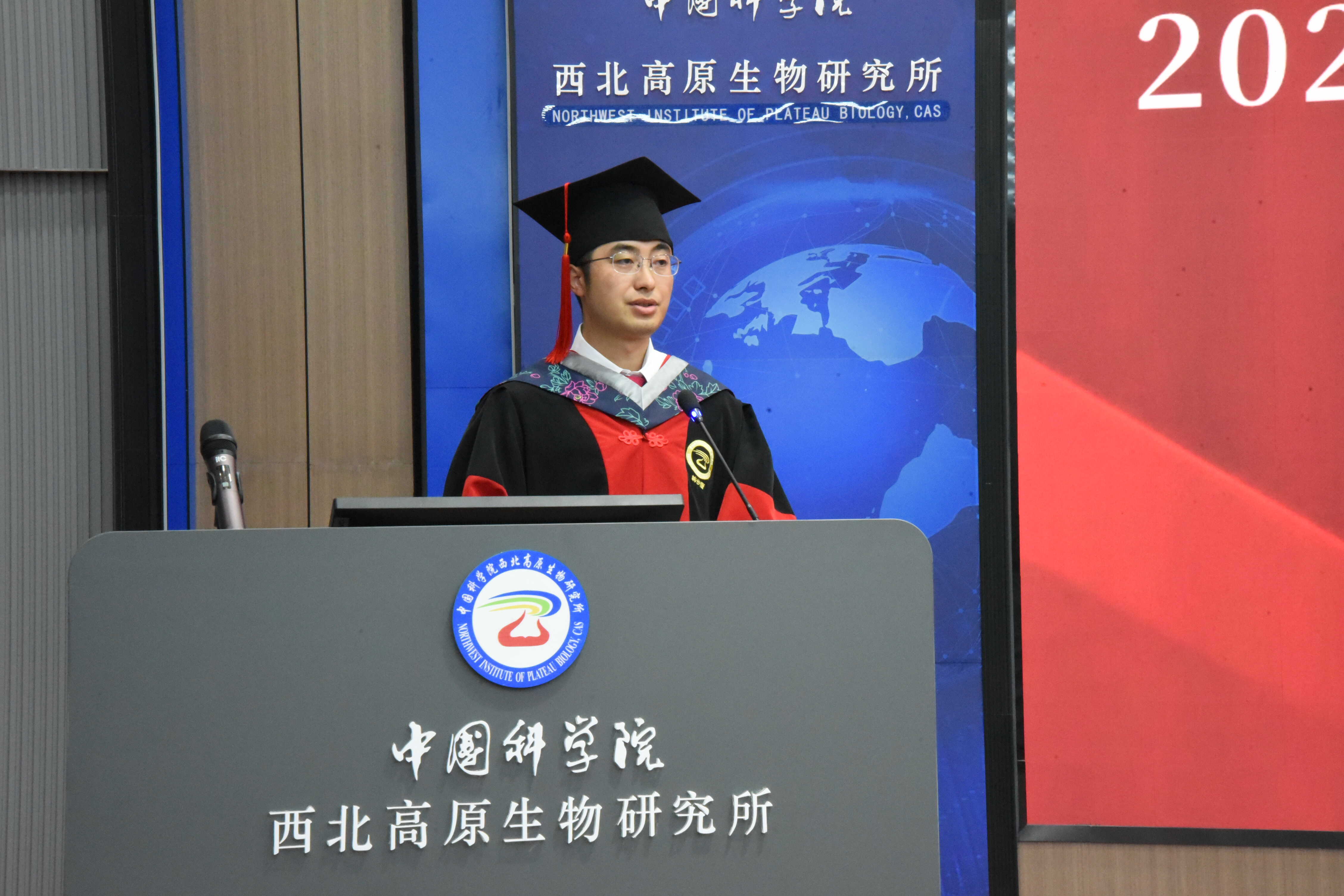 畢業(yè)典禮在莊嚴(yán)的國(guó)歌聲中拉開序幕。優(yōu)秀畢業(yè)生代表韓步鷹博士首先發(fā)言,他代表全體畢業(yè)生向培養(yǎng)他們的研究所和辛勤付出的導(dǎo)師們送上了最真摯的謝意和最美好的祝福。他說:“夏至是太陽(yáng)北行的轉(zhuǎn)折點(diǎn),亦是畢業(yè)生們的轉(zhuǎn)折點(diǎn)。畢業(yè)不是終點(diǎn),而是新的起點(diǎn)。未來,同學(xué)們將肩負(fù)更大的責(zé)任和使命,繼續(xù)在各自的領(lǐng)域中發(fā)光發(fā)熱”,并莊嚴(yán)承諾,無(wú)論未來身處何地,全體畢業(yè)生都會(huì)銘記在西北高原所學(xué)到的知識(shí)和“牦牛精神”,不忘初心,砥礪前行。