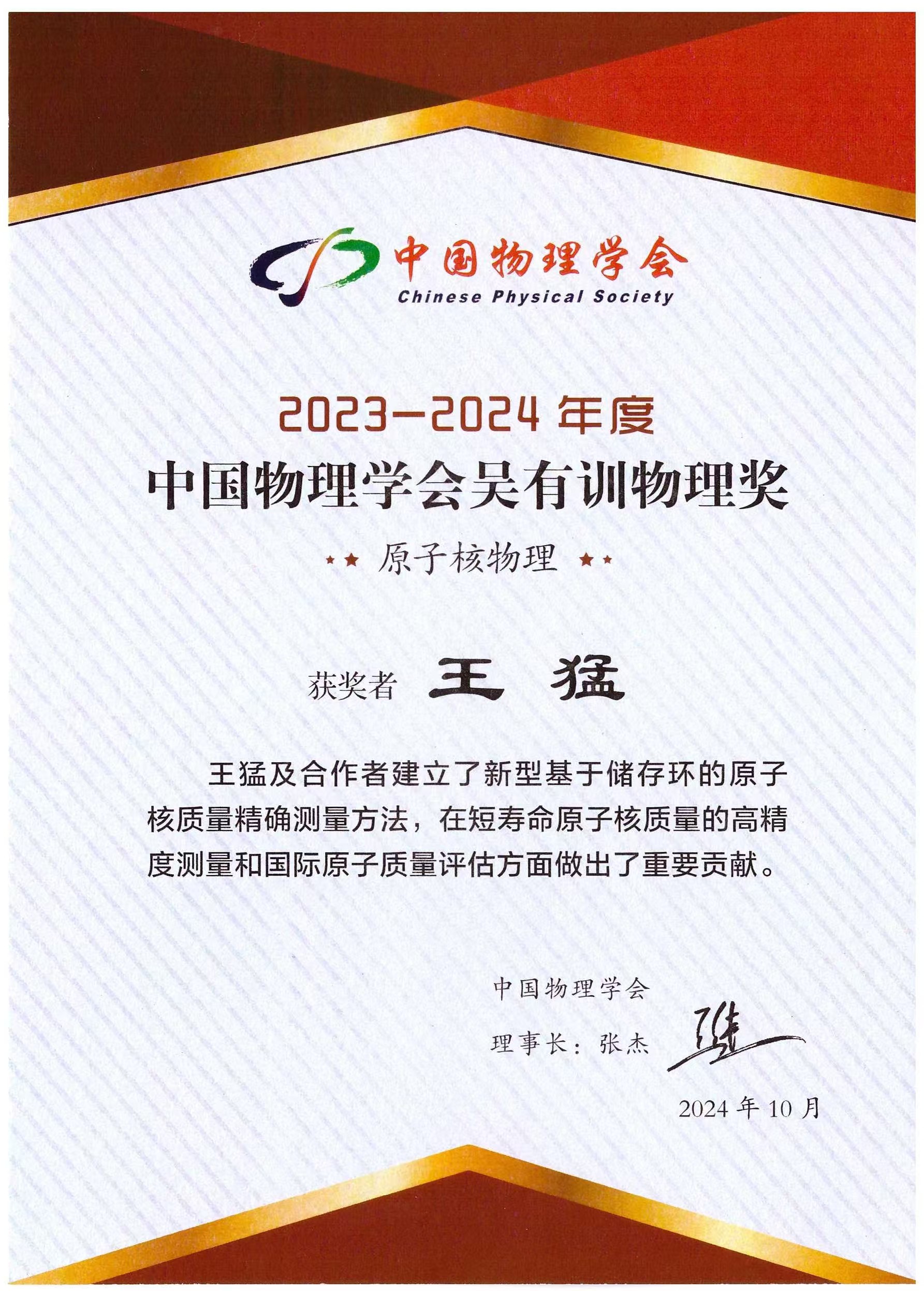 近代物理所王猛研究員獲吳有訓(xùn)物理獎