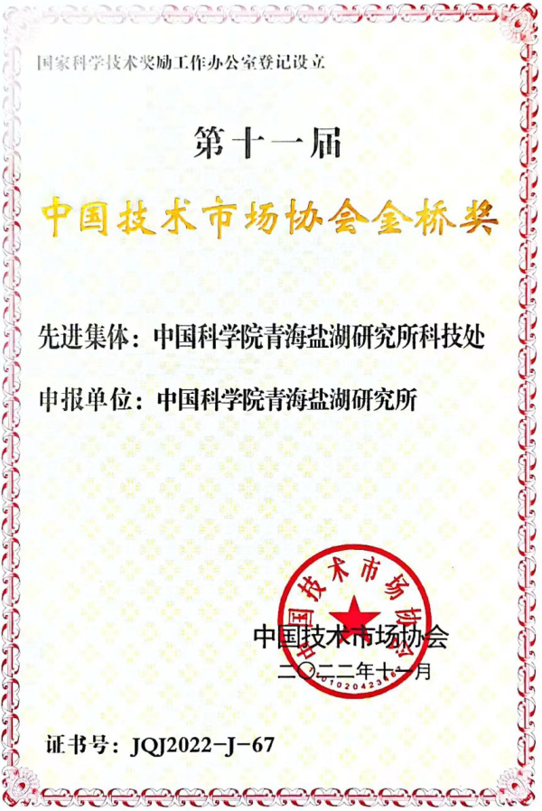 青海鹽湖所獲第十一屆中國技術市場協會金橋獎獎勵大會表彰