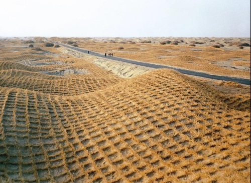實際上,草方格最早應用于我國第一條沙漠鐵路包蘭鐵路的建設中。在寧夏沙坡頭地區(qū)火車穿越了騰格里沙漠,在科技工作者和當?shù)厝罕姷墓餐ο?,麥草方格編成的巨網最終成功縛住了“沙龍”。沙坡頭因此被稱為“草方格的故鄉(xiāng)”。如今,一把鐵鍬,一捆麥草,一片草方格,沙坡頭實現(xiàn)了黃沙變綠洲的嬗變,騰格里沙漠中神奇地出現(xiàn)了一條連綿延伸的“綠帶”。